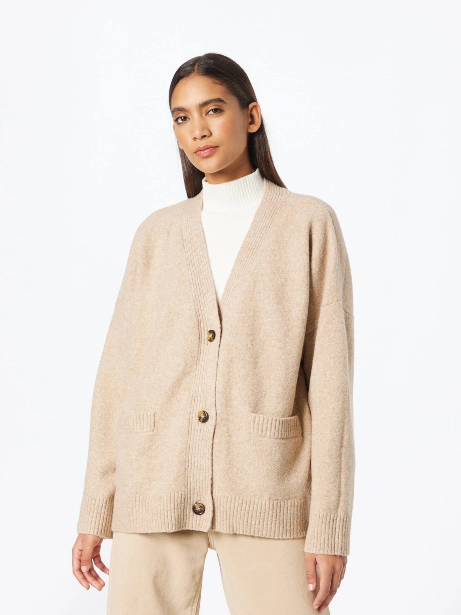 MélangeCol VBoutonnièreBord côteléÉpaules largesPoches latéralesFaçonnéDoux au toucherFermeture à bouton